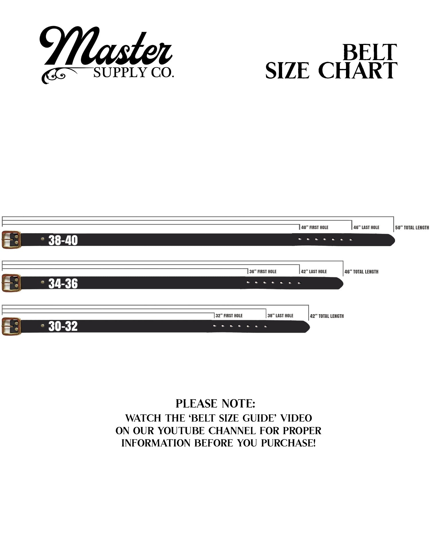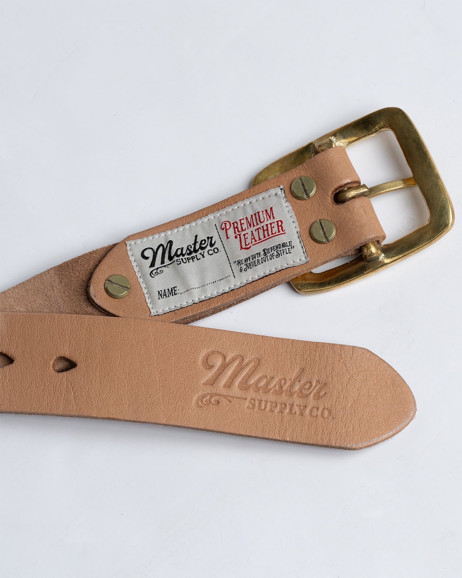 Crafted for the long haul, our Master Supply Co leather belts are a rugged and versatile addition to your collection. Made from 100% vegetable-tanned buffalo leather, these belts boast a robust 4.2mm thickness, ensuring durability and longevity. The solid brass hardware is built to last, while the Master embossed adds subtle branding.