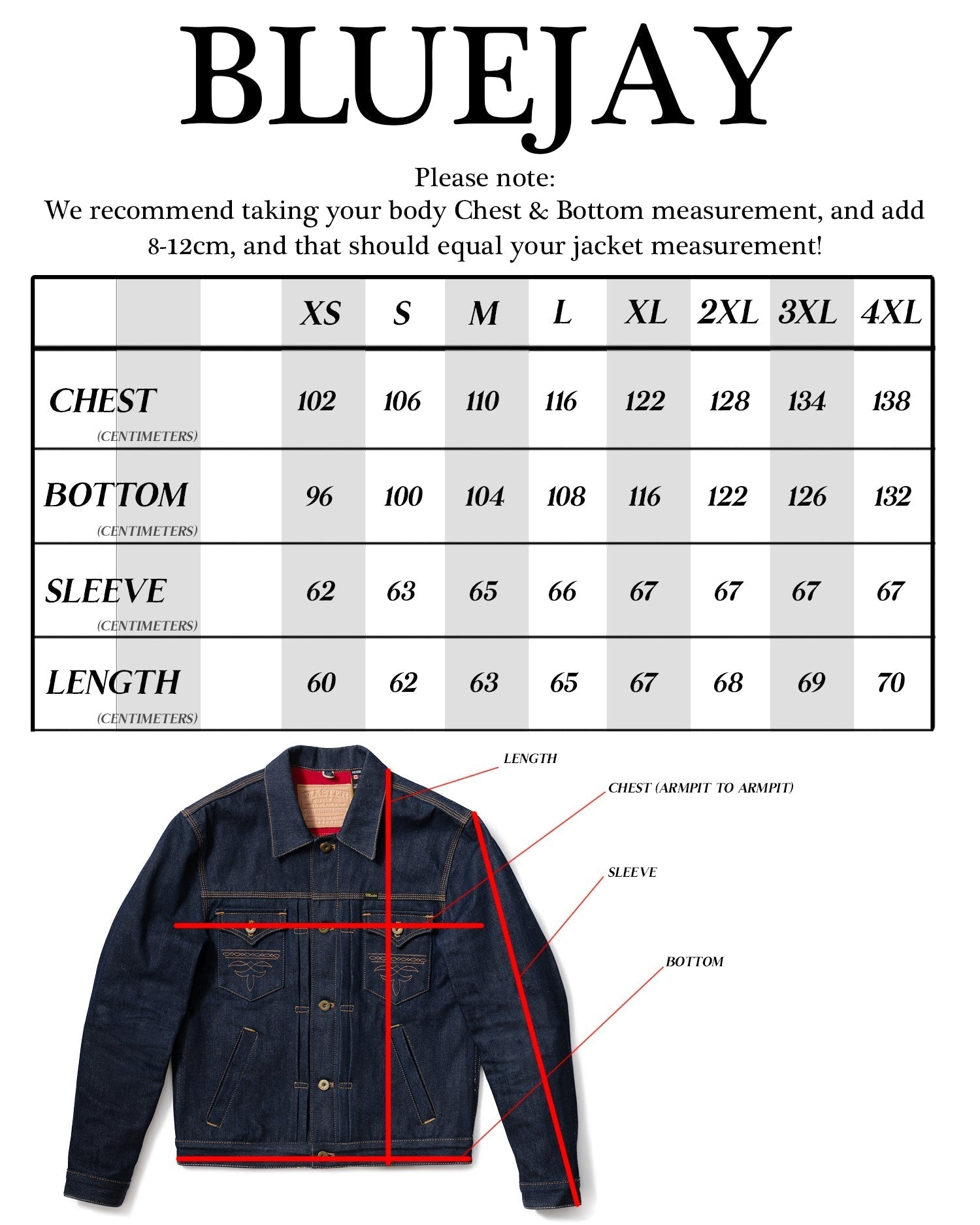 The Bluejay is made to wear in, not wear out. With consistent use, it will develop high-contrast creases, patina, and uniquely personal fades. Spot-clean when necessary; delay washing to allow the denim’s character to deepen. If soaked, expect minimal shrinkage (~3%). As with all richly dyed raw denim, color transfer is normal in early wear—avoid pairing with light fabrics.