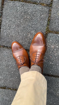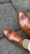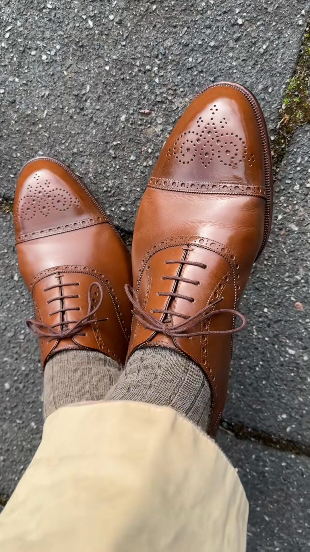 These brown leather brogue Oxford shoes feature intricate perforation patterns on the toe cap, adding a classic and stylish touch. They have a lace - up design, paired with light brown socks and beige trousers. Ideal for semi - formal or smart - casual occasions, these shoes combine timeless elegance with a touch of sophistication, making them suitable for both professional and social settings.