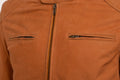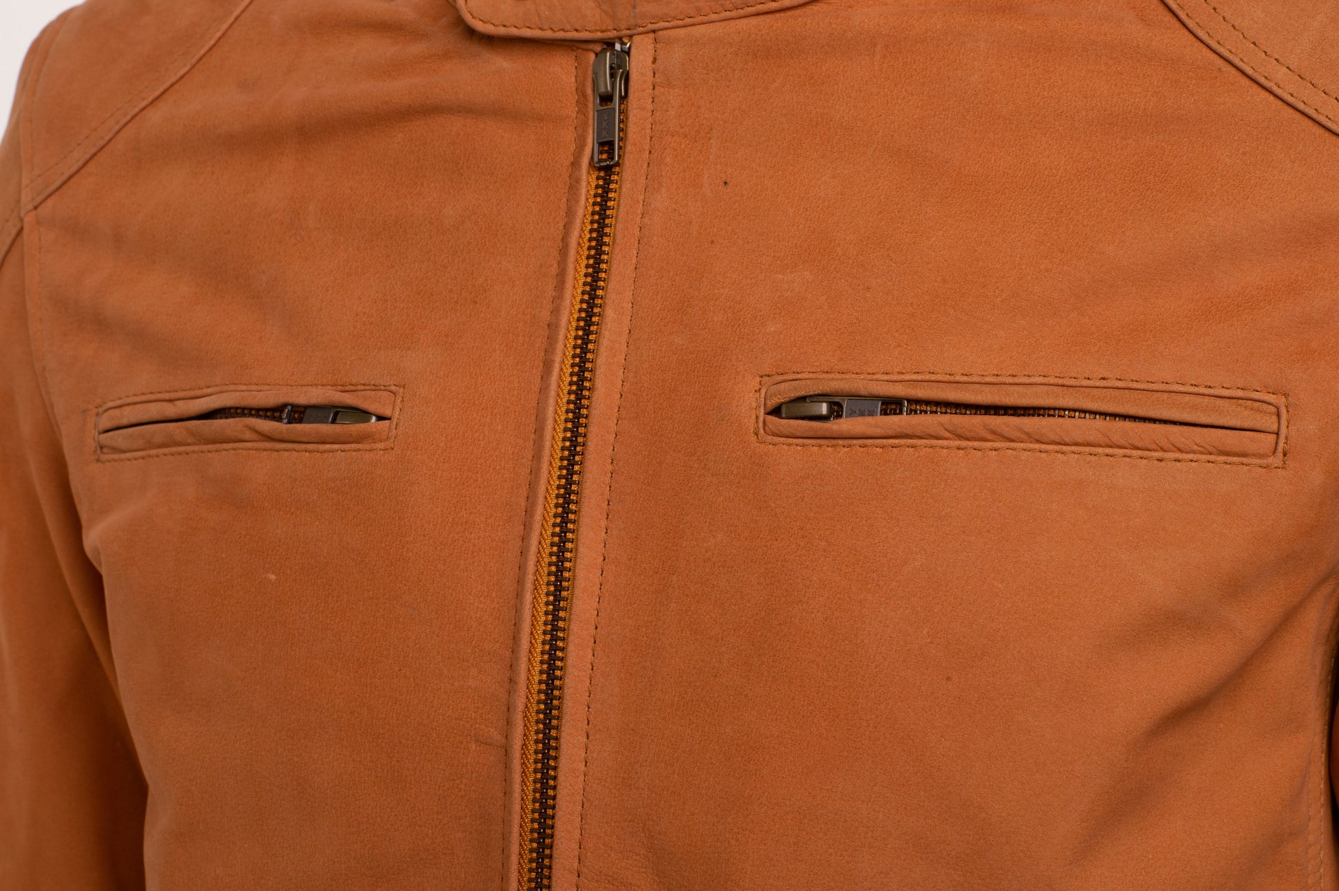 Want to try something cool and unique? A plain moto-style jacket in nubuck leather from Steve's can meet all your needs. This jacket is available in 50 different colors. It has a satin polyester inner lining and zipper closure for a snug fit. Even more, it has snap buttons on the round neck collar and zip cuffs. Also, it has 1 pocket inside and 4 functional pockets outside.