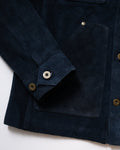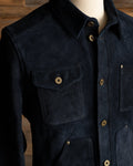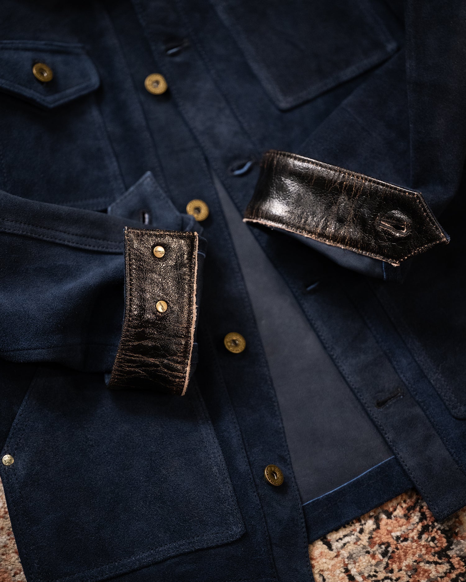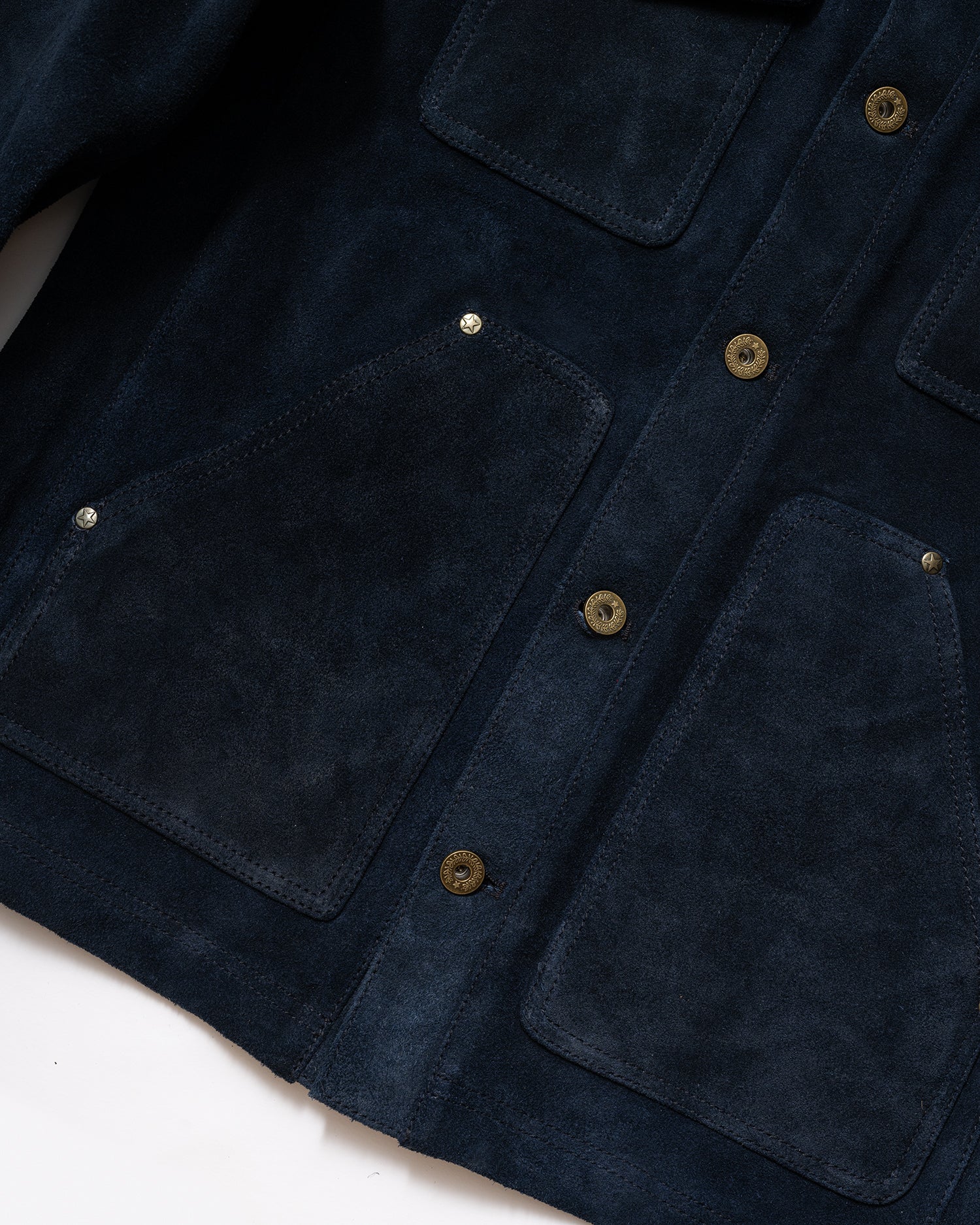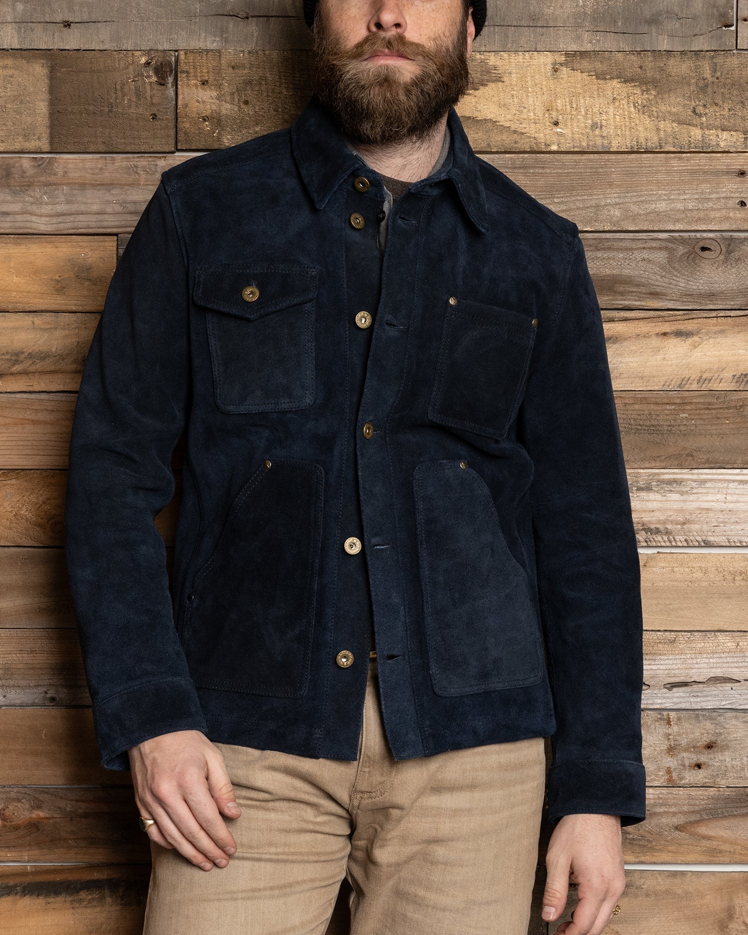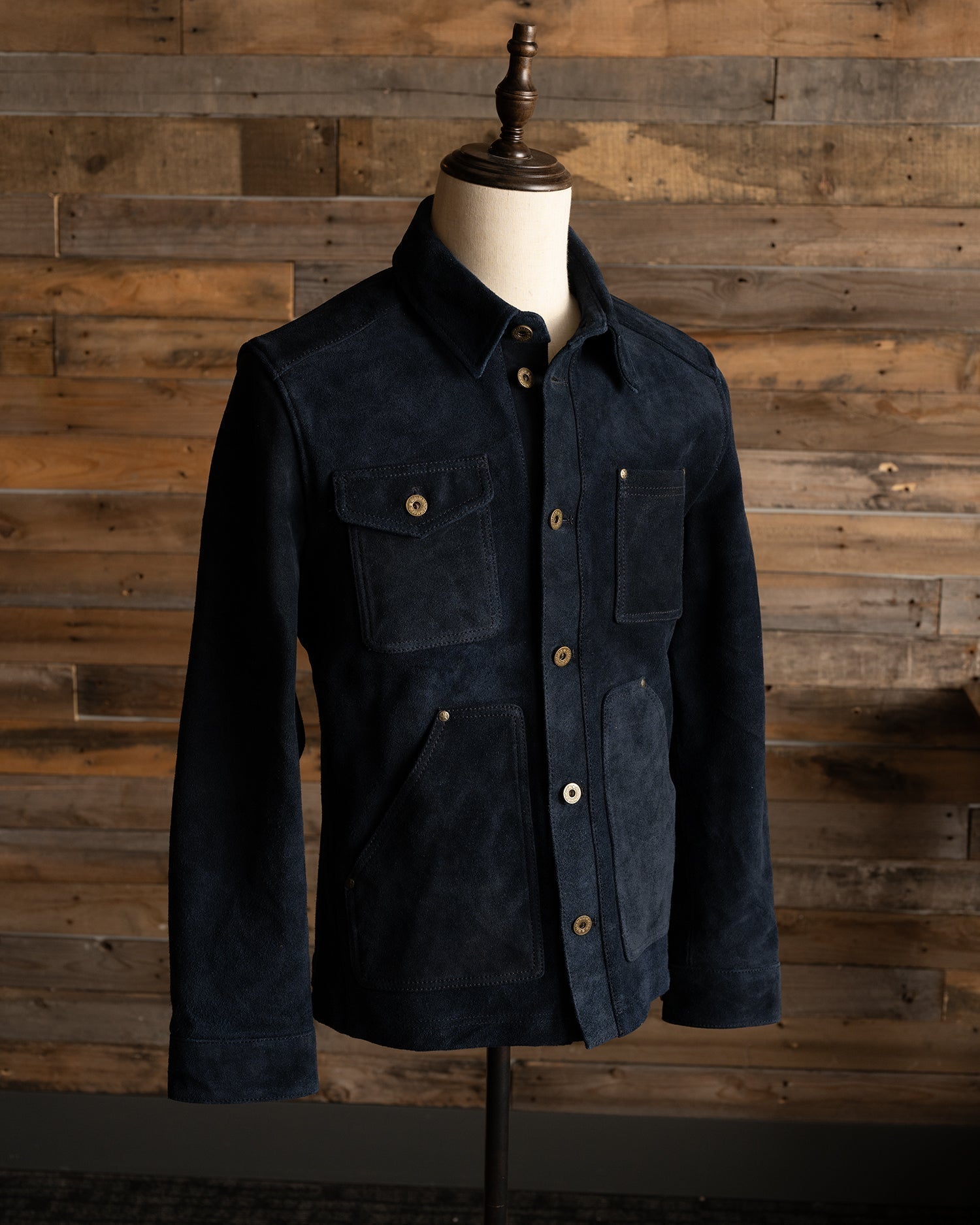 A rugged reinterpretation of the classic chore coat, built for durability, utility, and all-season wear. Cut from full-grain roughout cowhide in a deep navy blue, this unlined Field Jacket is designed to break in beautifully and age with character.