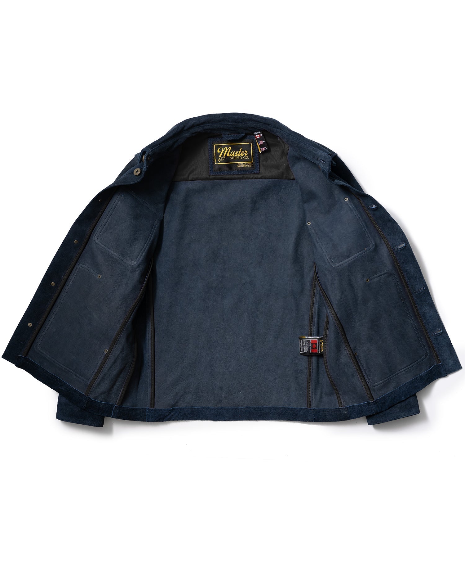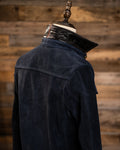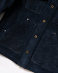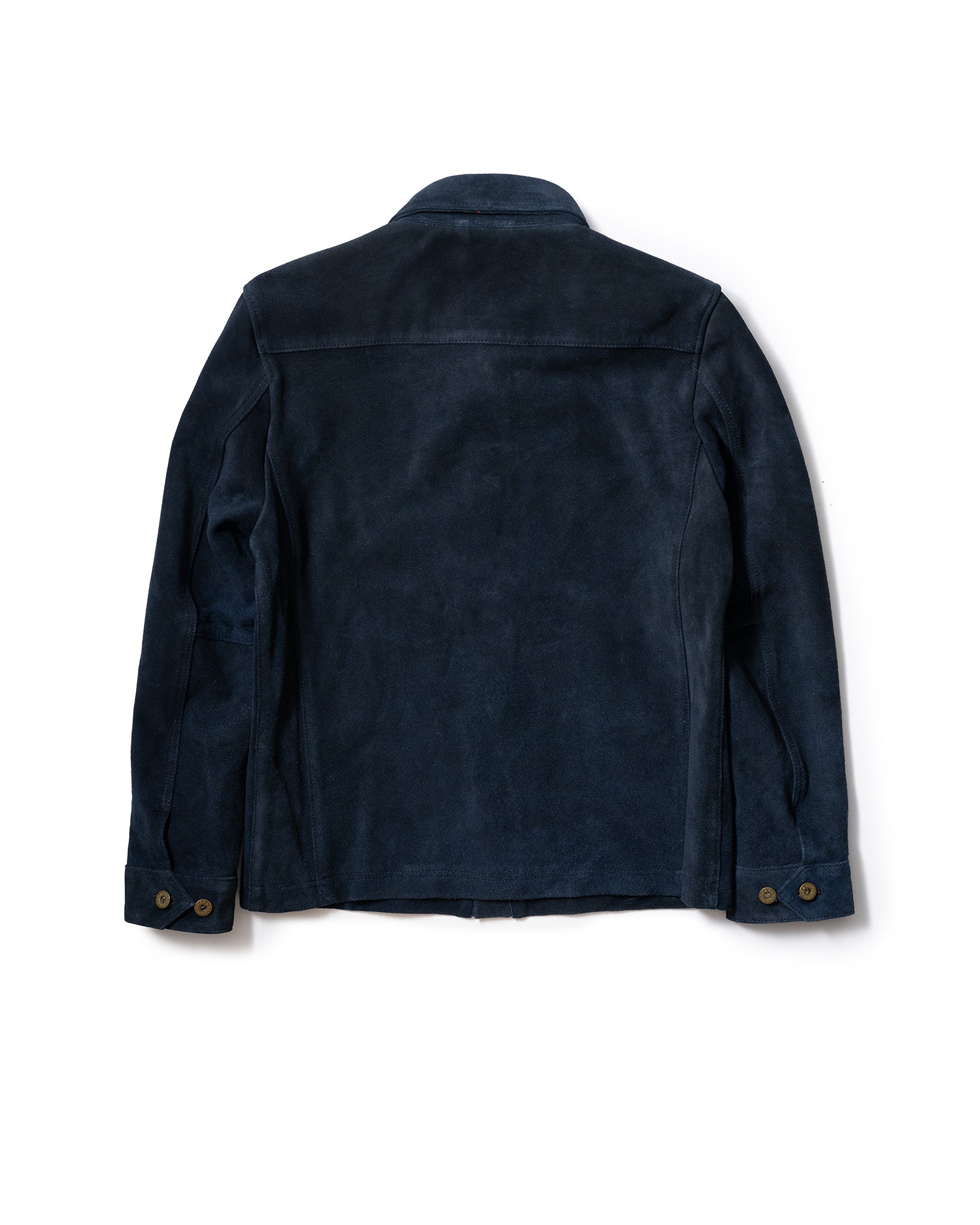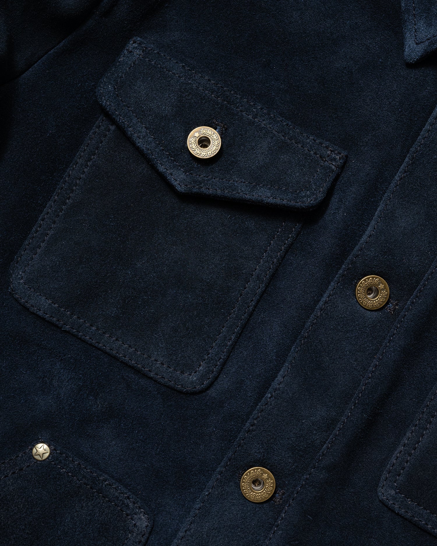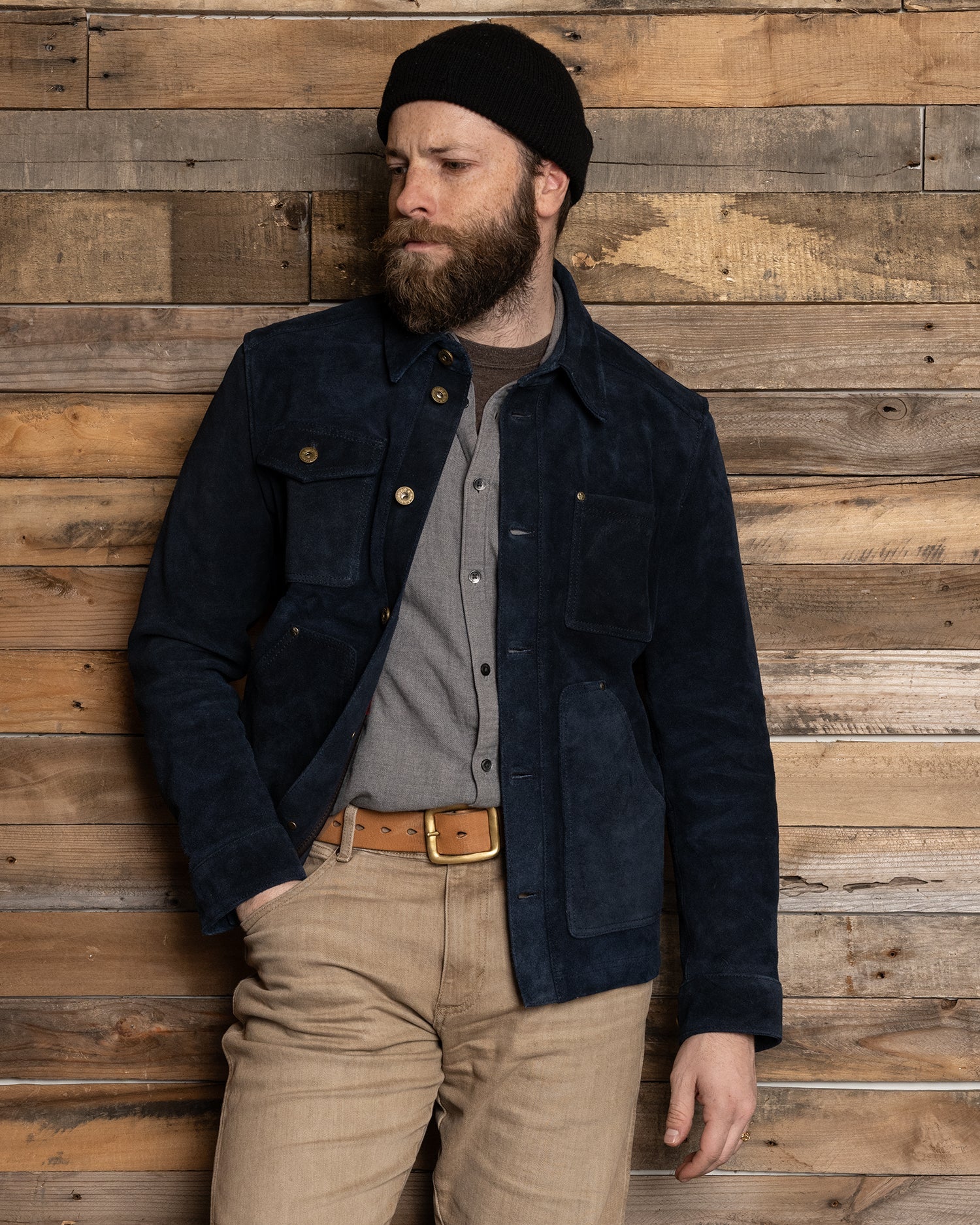A rugged reinterpretation of the classic chore coat, built for durability, utility, and all-season wear. Cut from full-grain roughout cowhide in a deep navy blue, this unlined Field Jacket is designed to break in beautifully and age with character.
