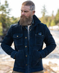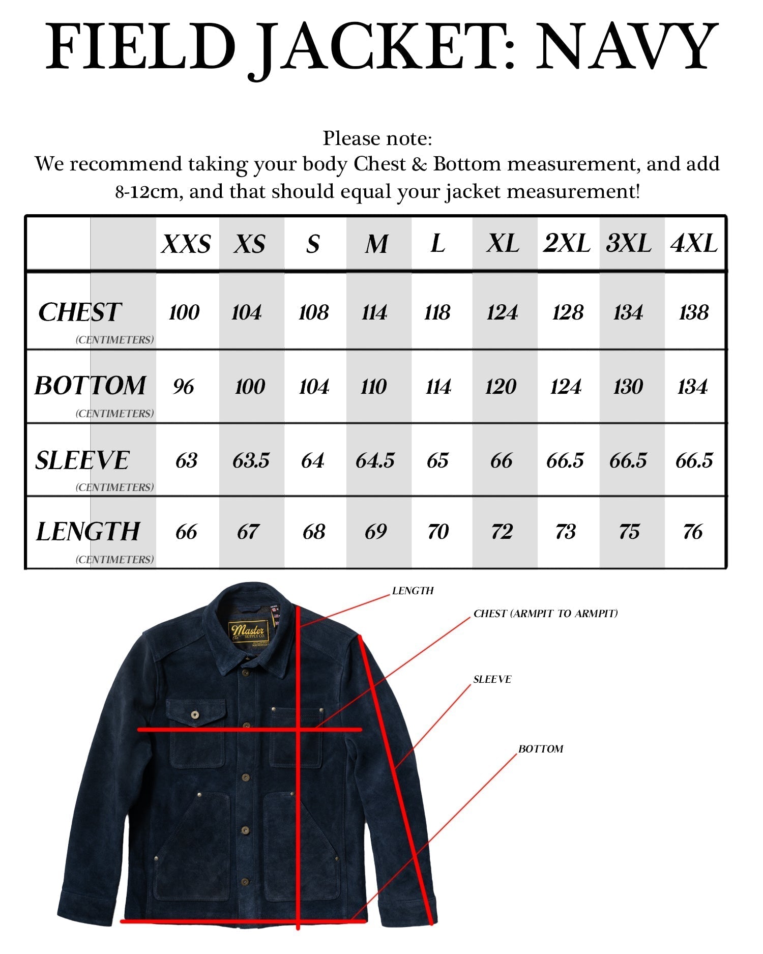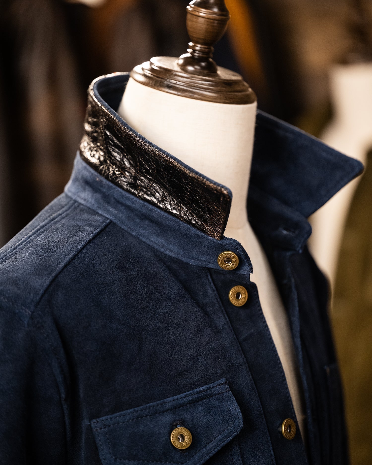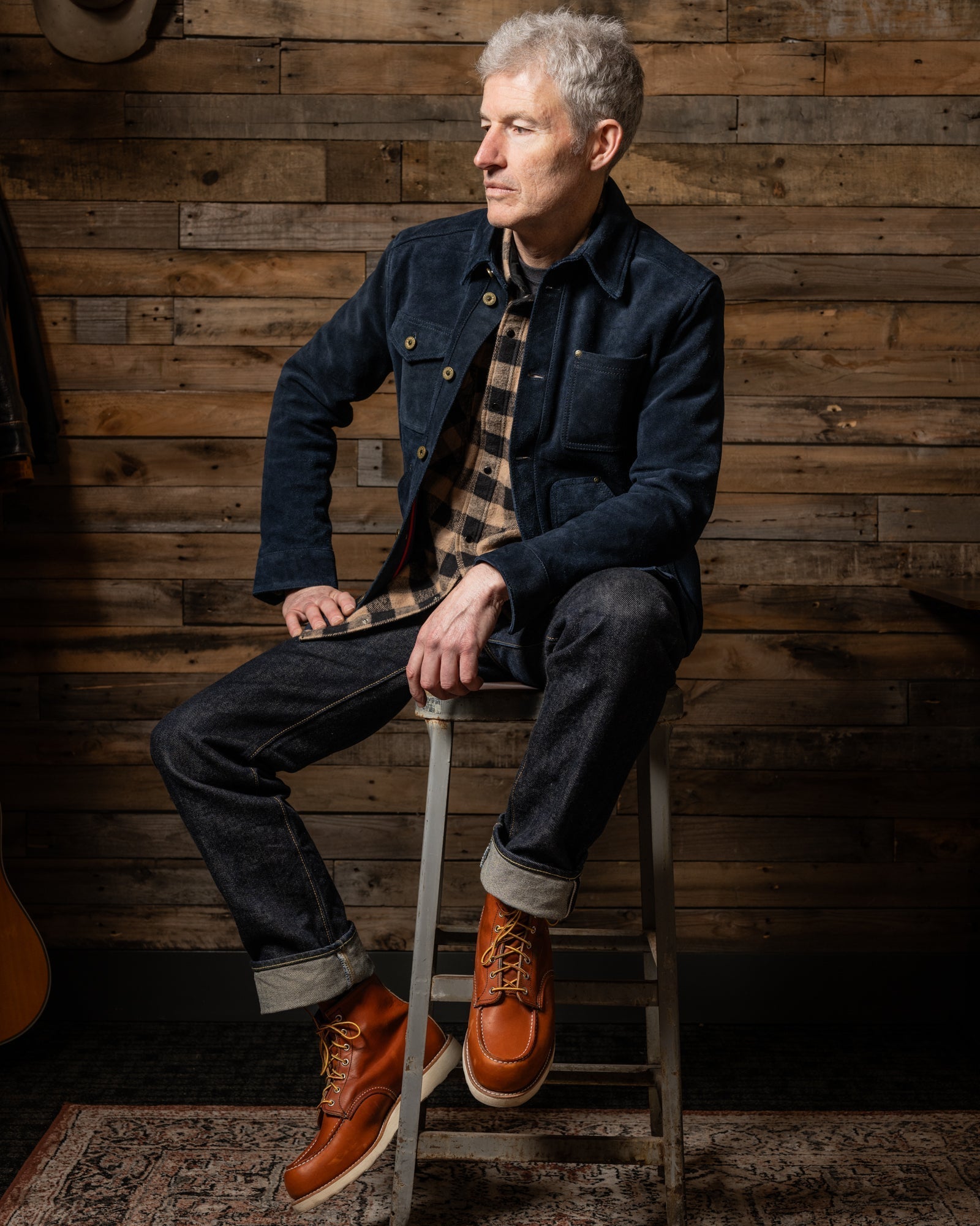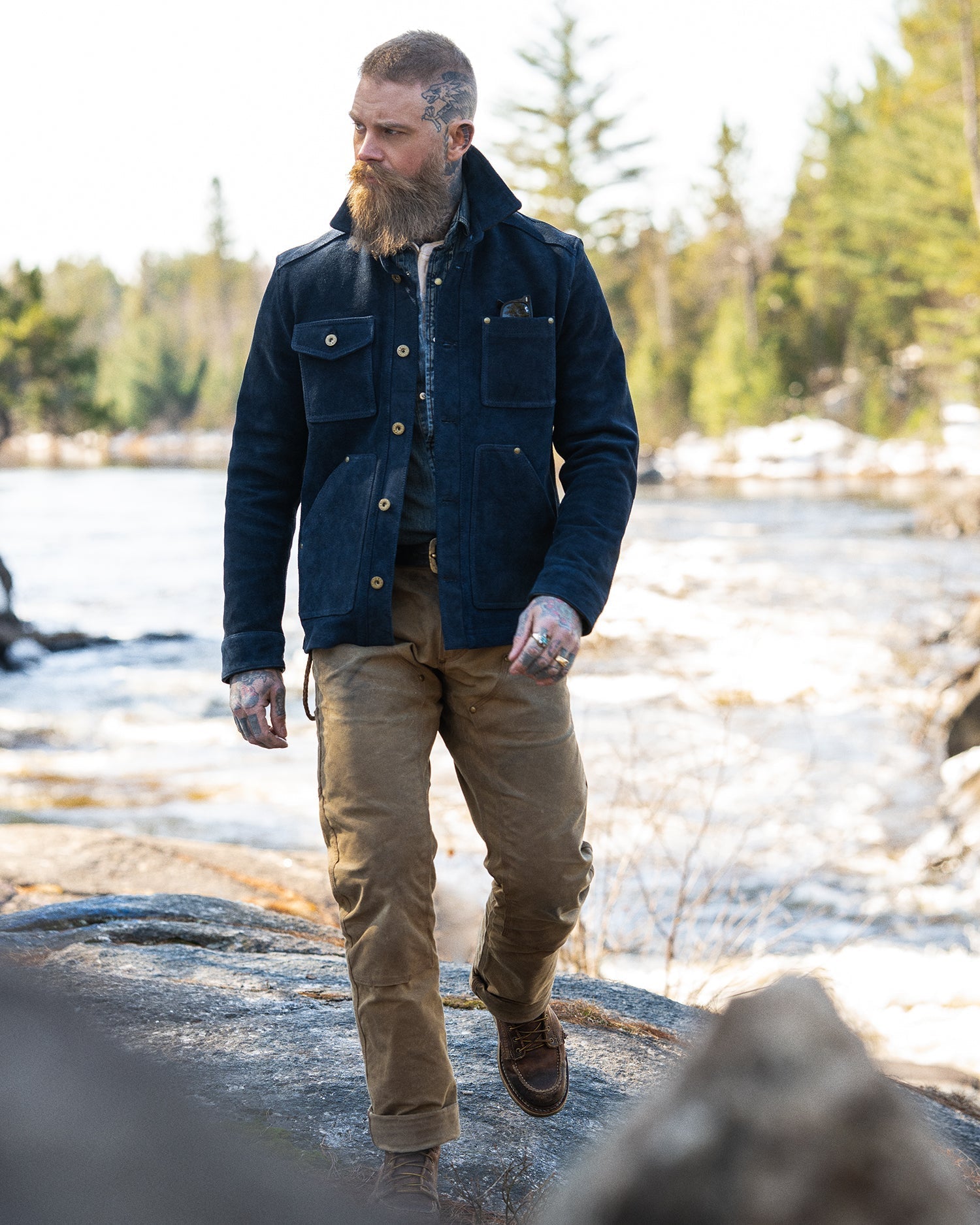 A rugged reinterpretation of the classic chore coat, built for durability, utility, and all-season wear. Cut from full-grain roughout cowhide in a deep navy blue, this unlined Field Jacket is designed to break in beautifully and age with character.