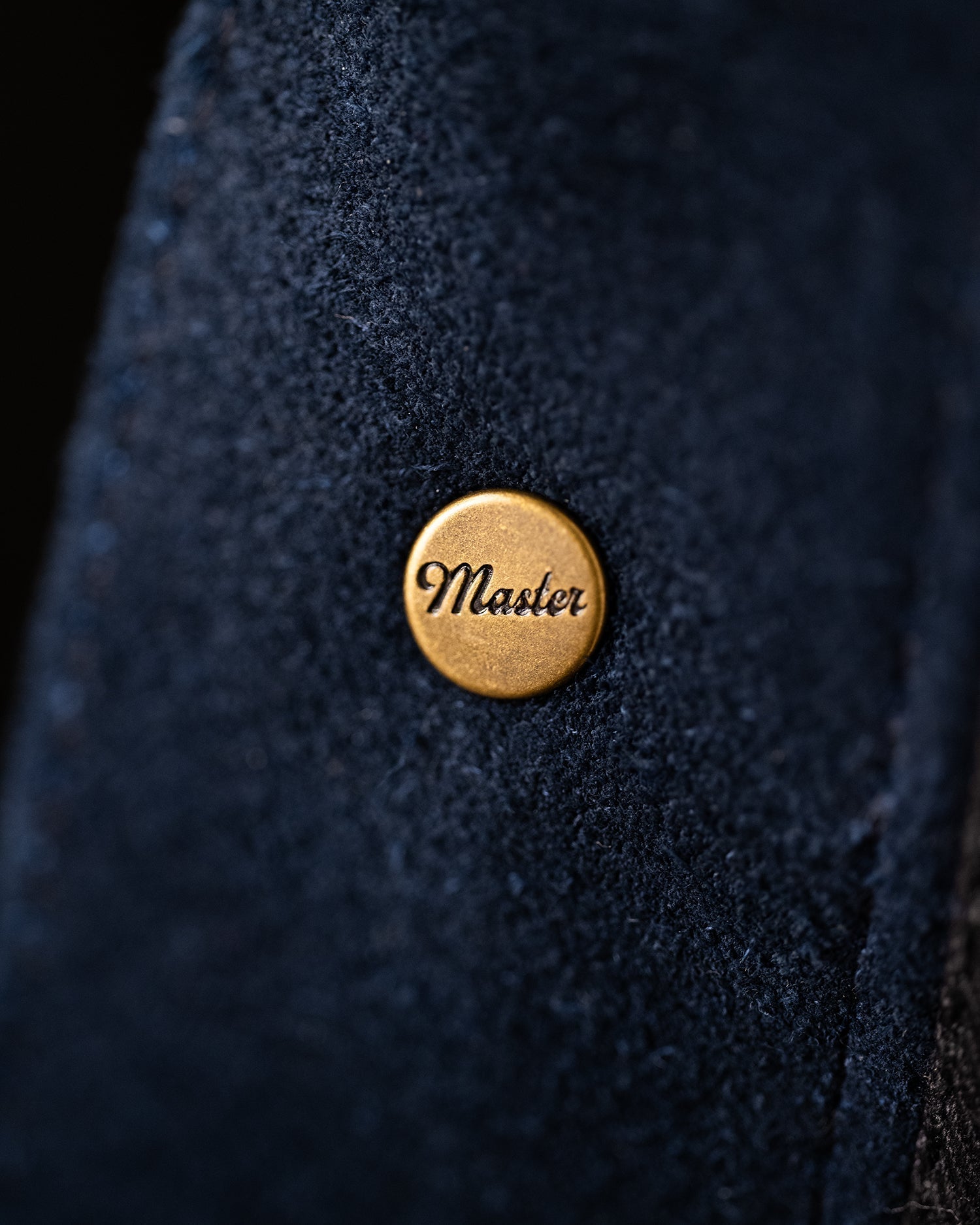 It features three reinforced patch pockets—two angled hand-warmer pockets and a left chest pocket—plus an additional buttoned flap pocket on the right chest. Each is strategically placed for accessibility and finished with rivets for extra durability. The jacket fastens with custom Master Supply Co. solid zinc donut buttons in antique finish, designed with a two-prong anchor for long-term reliability.