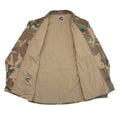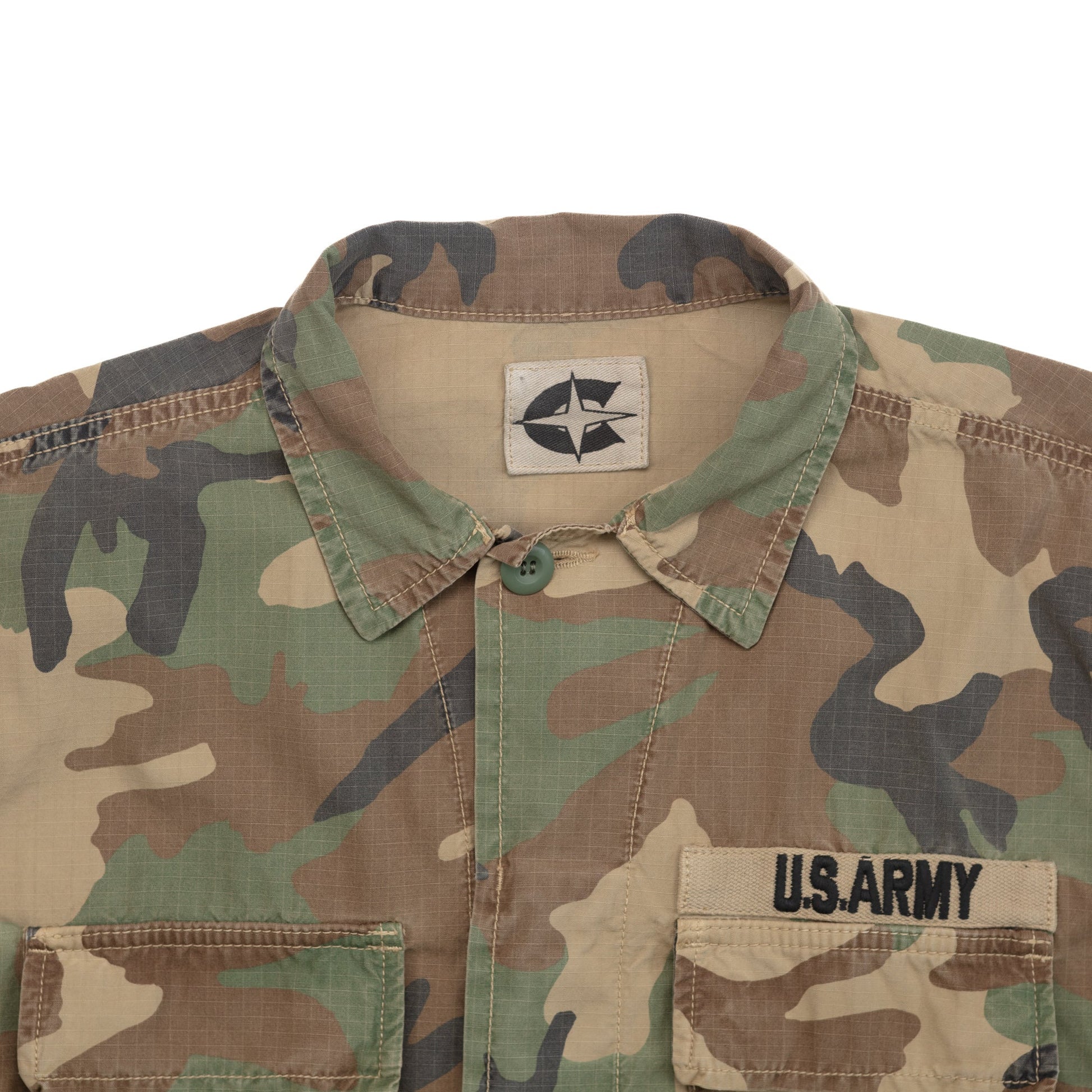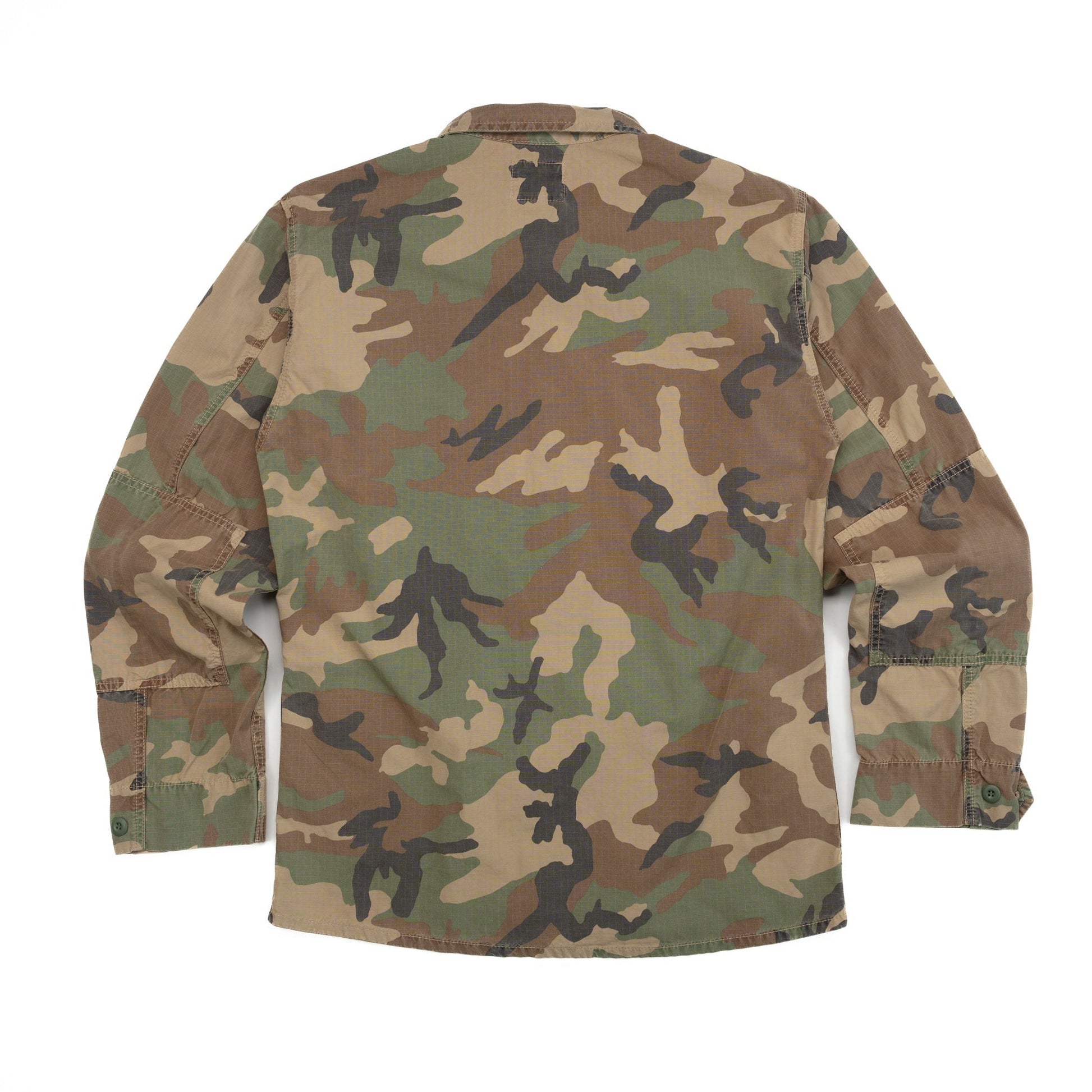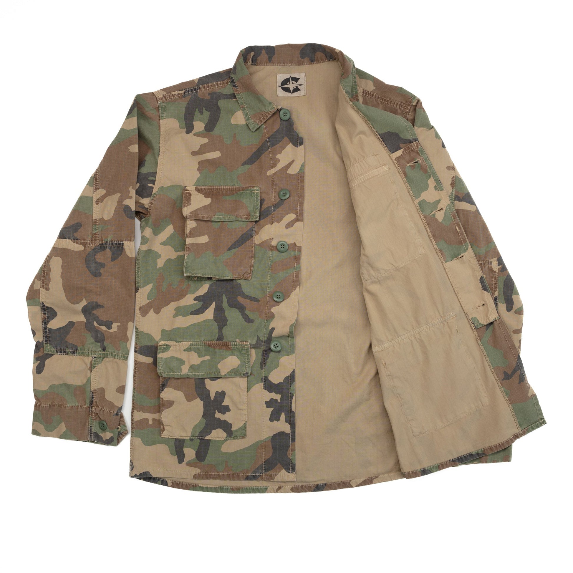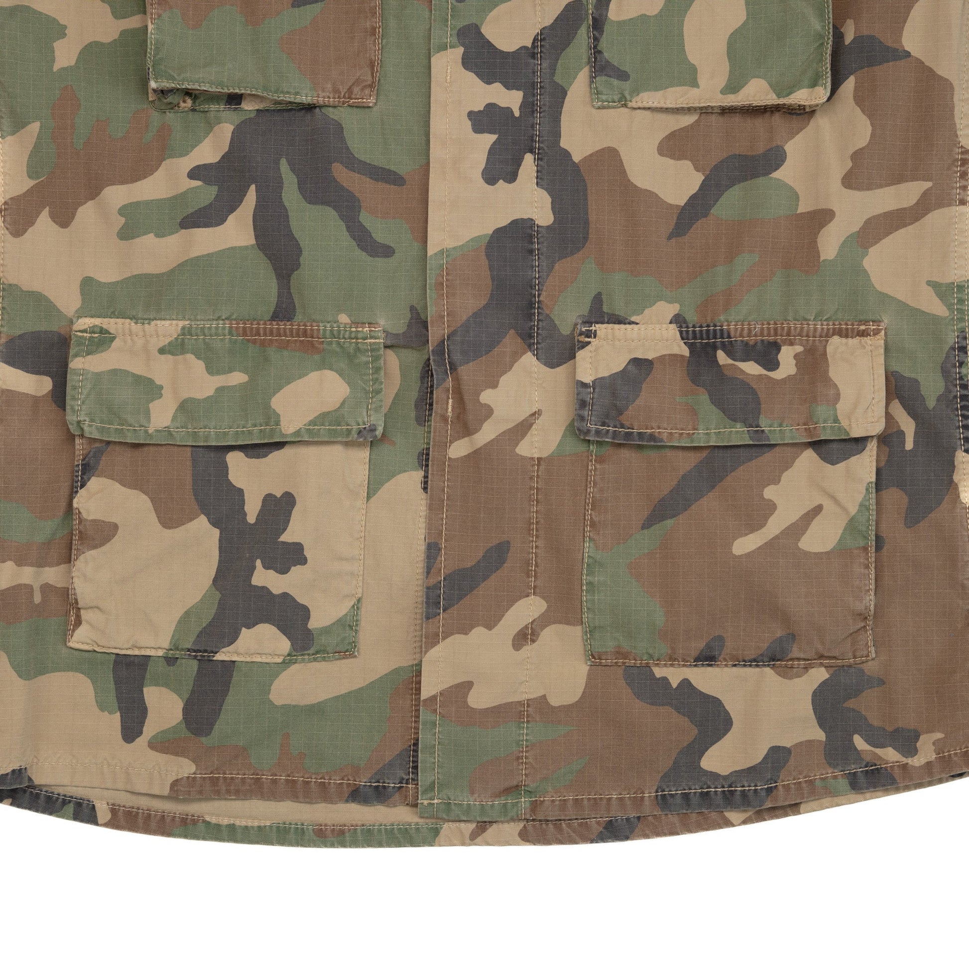 Military inspired all the way, but with a revised fit that's not your usual over-sized cut. Made from a camo pattern that's been washed to give a lived in look. The fabric is a cotton ripstop which adds a subtle contemporary detail to an otherwise vintage military style.