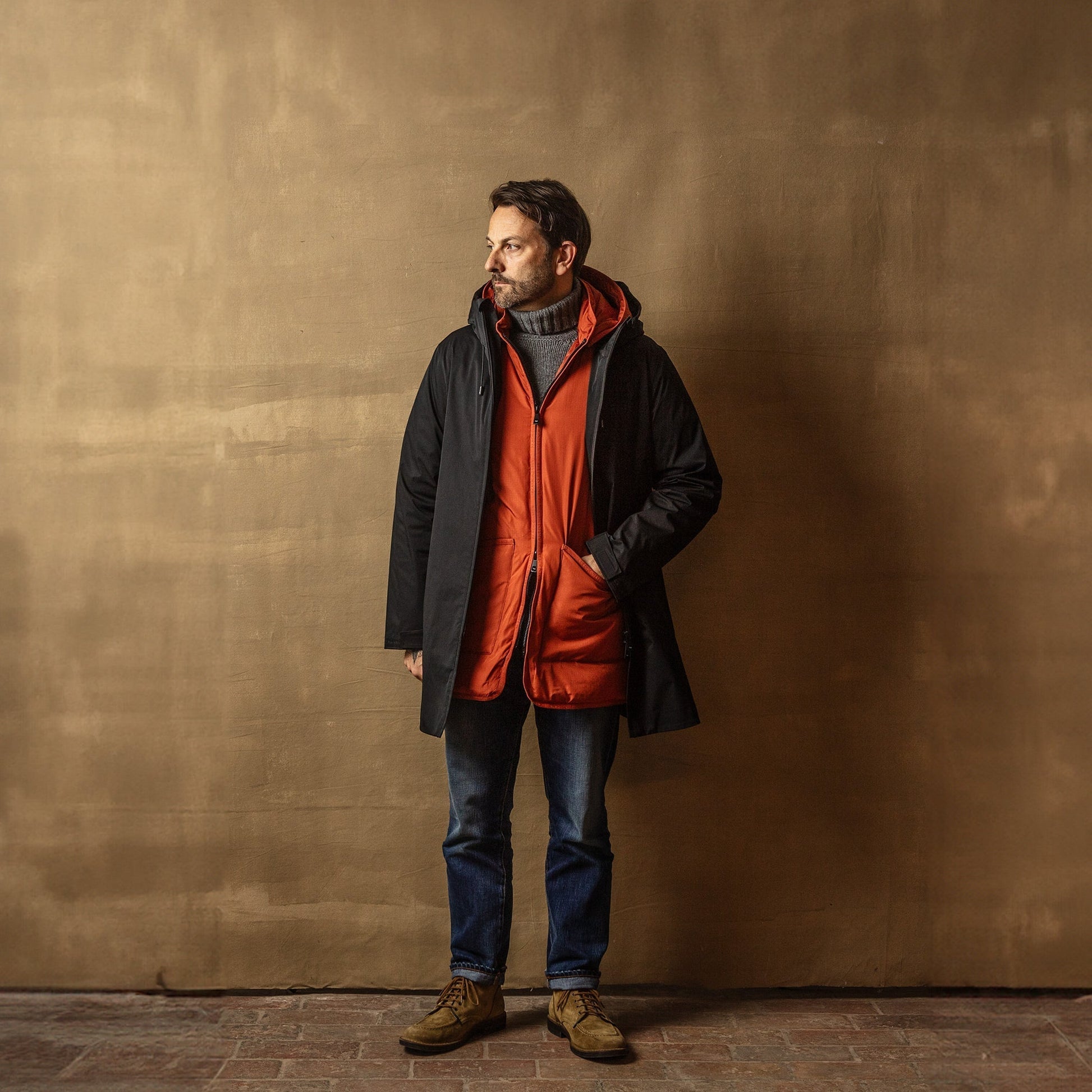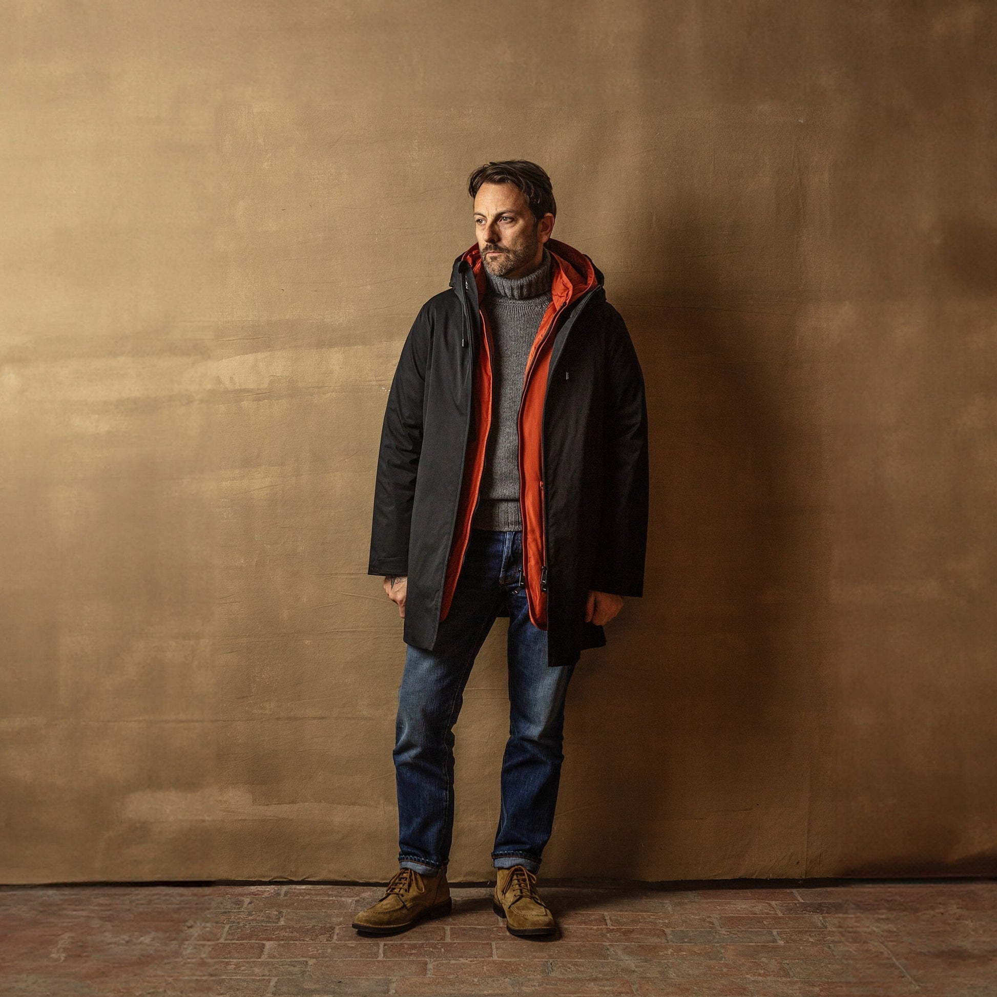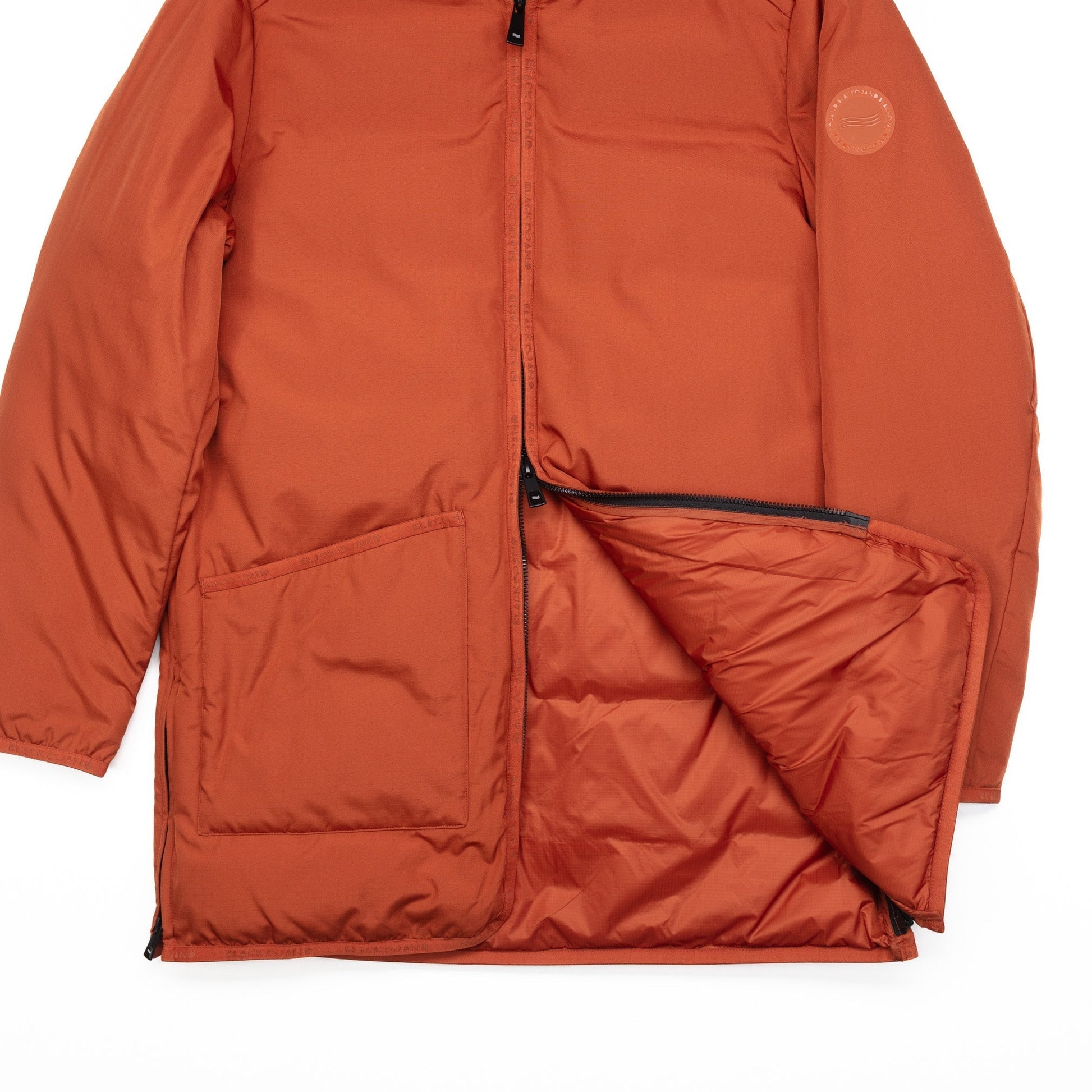A long insulated hooded jacket made from ripstop from the Italian brand Black Sand, who specialise in stylish outerwear that is technical, functional and most importantly looks great on.