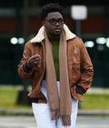 This can become more than just another brown bomber jacket. It’s your very own conversation starter. Each patch and detail of this leather aviator jacket has been carefully chosen to reflect authentic military heritage. The ribbed cuffs and hem of this shearling leather jacket don’t just keep you warm—they maintain that classic silhouette that’s been turning heads since the golden age of aviation.
