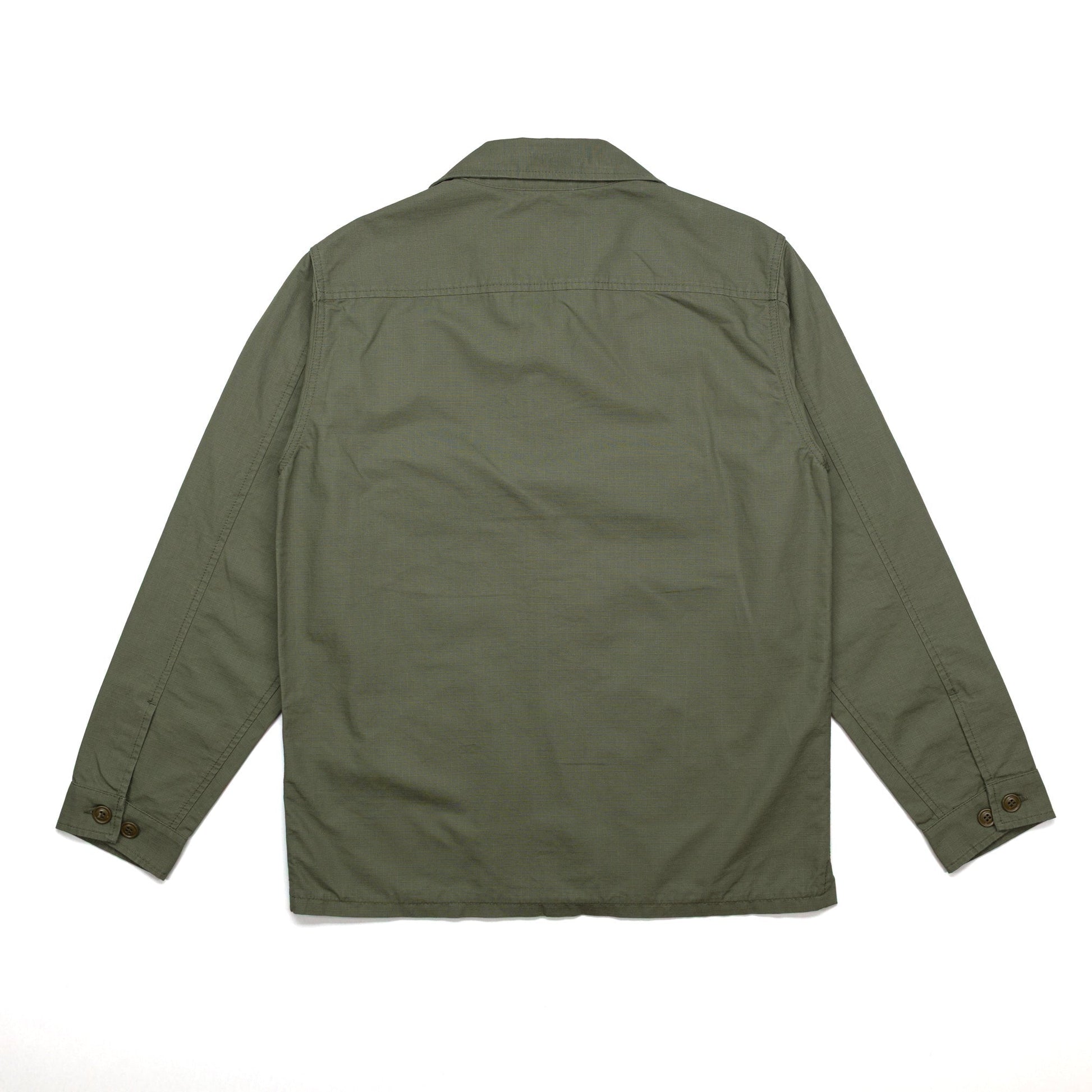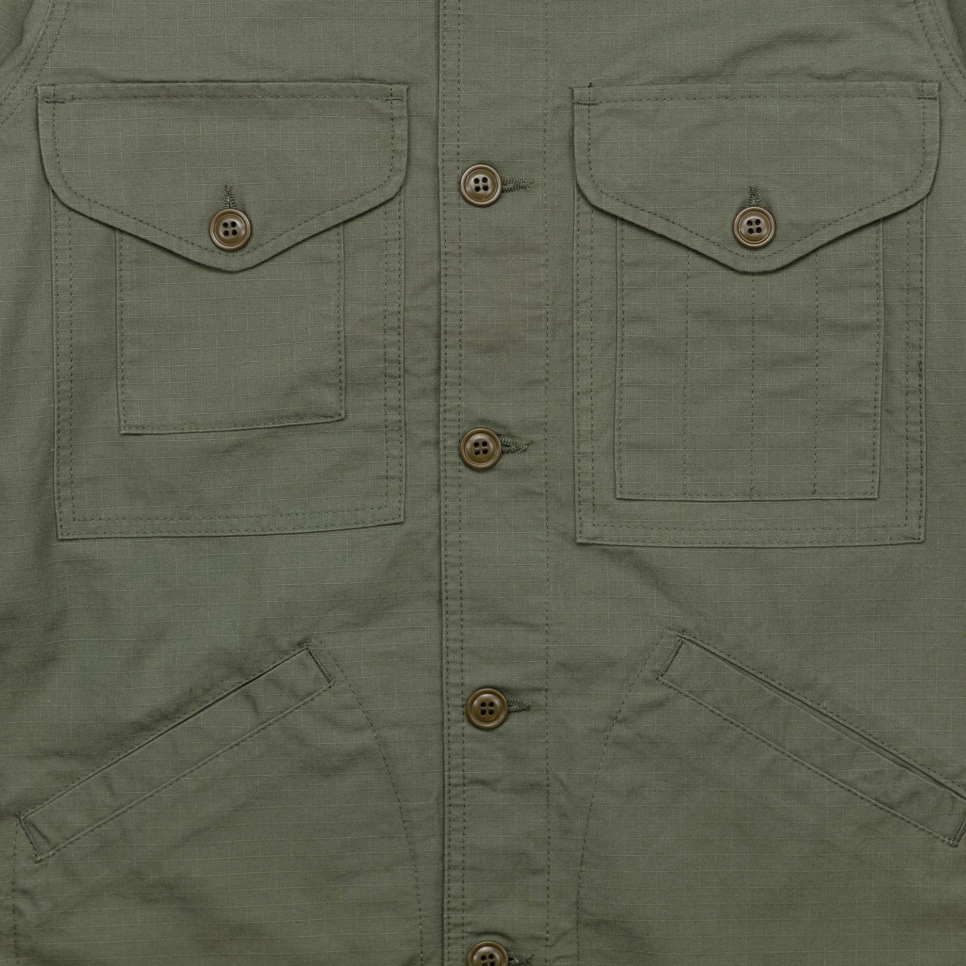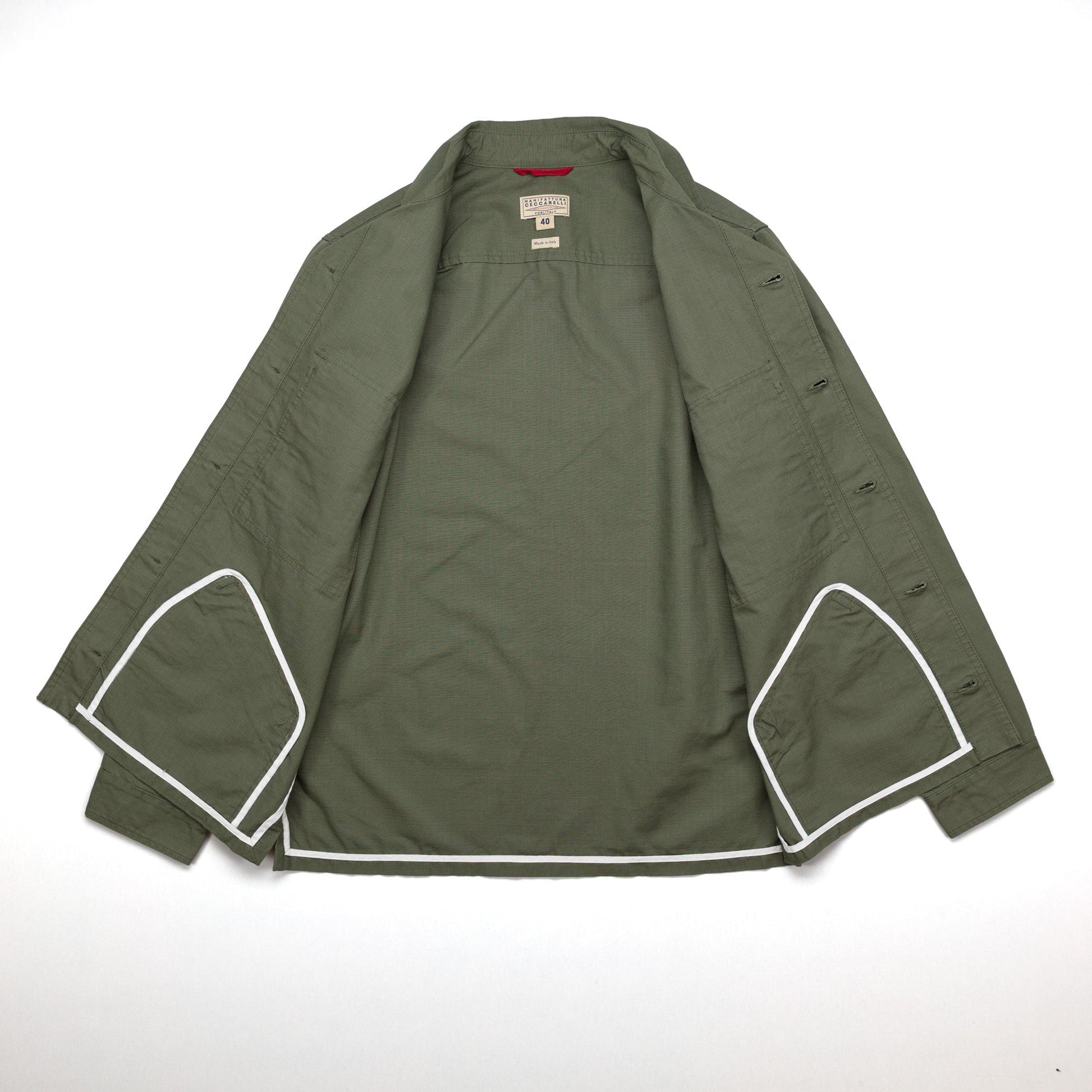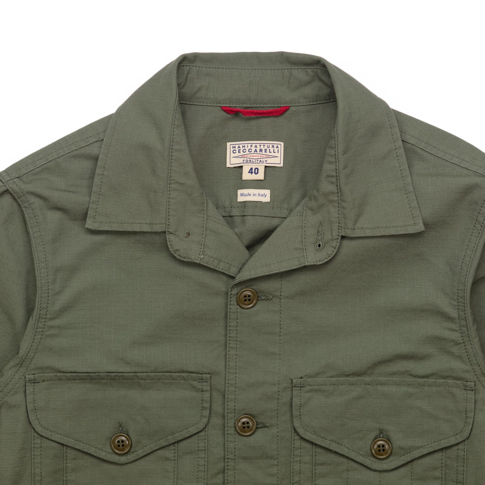 Originally used for military garments, ripstop fabric is known for its anti-tear properties. The buttons are made of injection resin, a durable material commonly used in military supplies. Made with high-quality fabric from Japan and buttons from the USA, this jacket is proudly made in Italy.