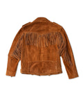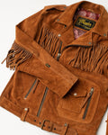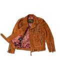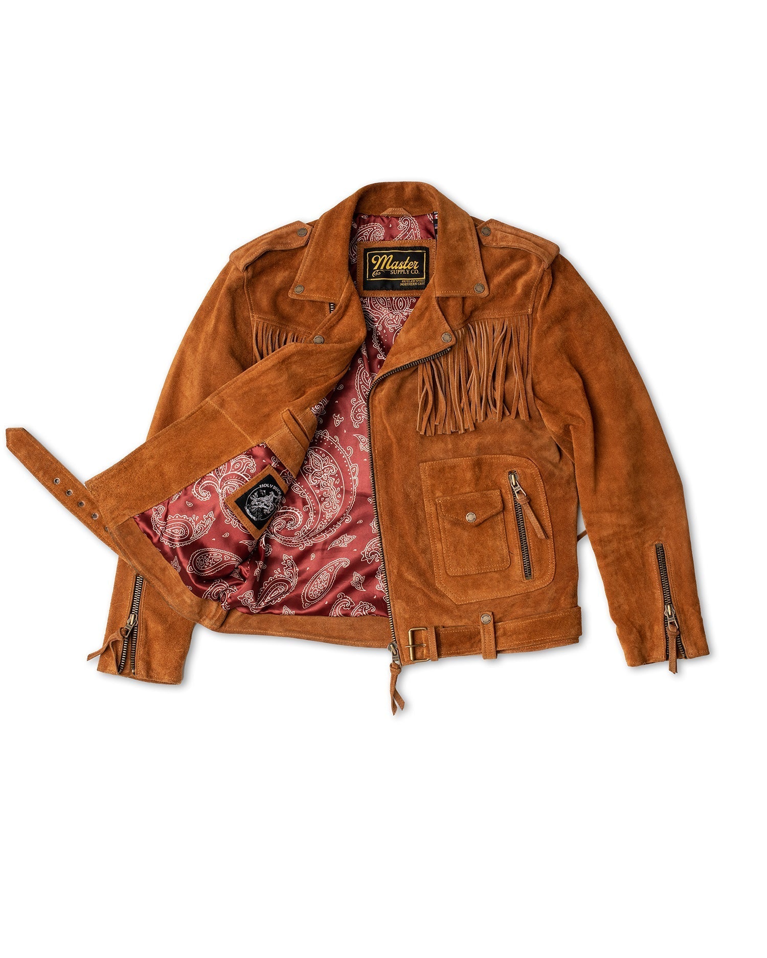 Made from our rough-out cowhide, this double rider is unapologetically bold—finished with Western-inspired fringe that moves with purpose and attitude. Inside, a custom red and white paisley satin liner adds a hit of colour, brought to life through vibrant sublimation printing. Antique-finish hardware rounds out the design with a time-worn edge that feels right at home under open skies or neon lights.