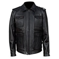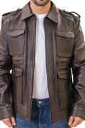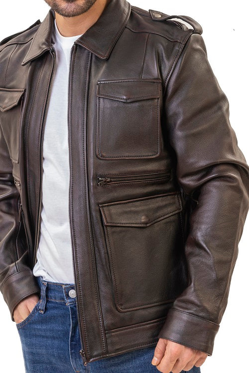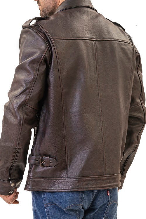 River distressed brown motorcycle leather jacket with large pockets