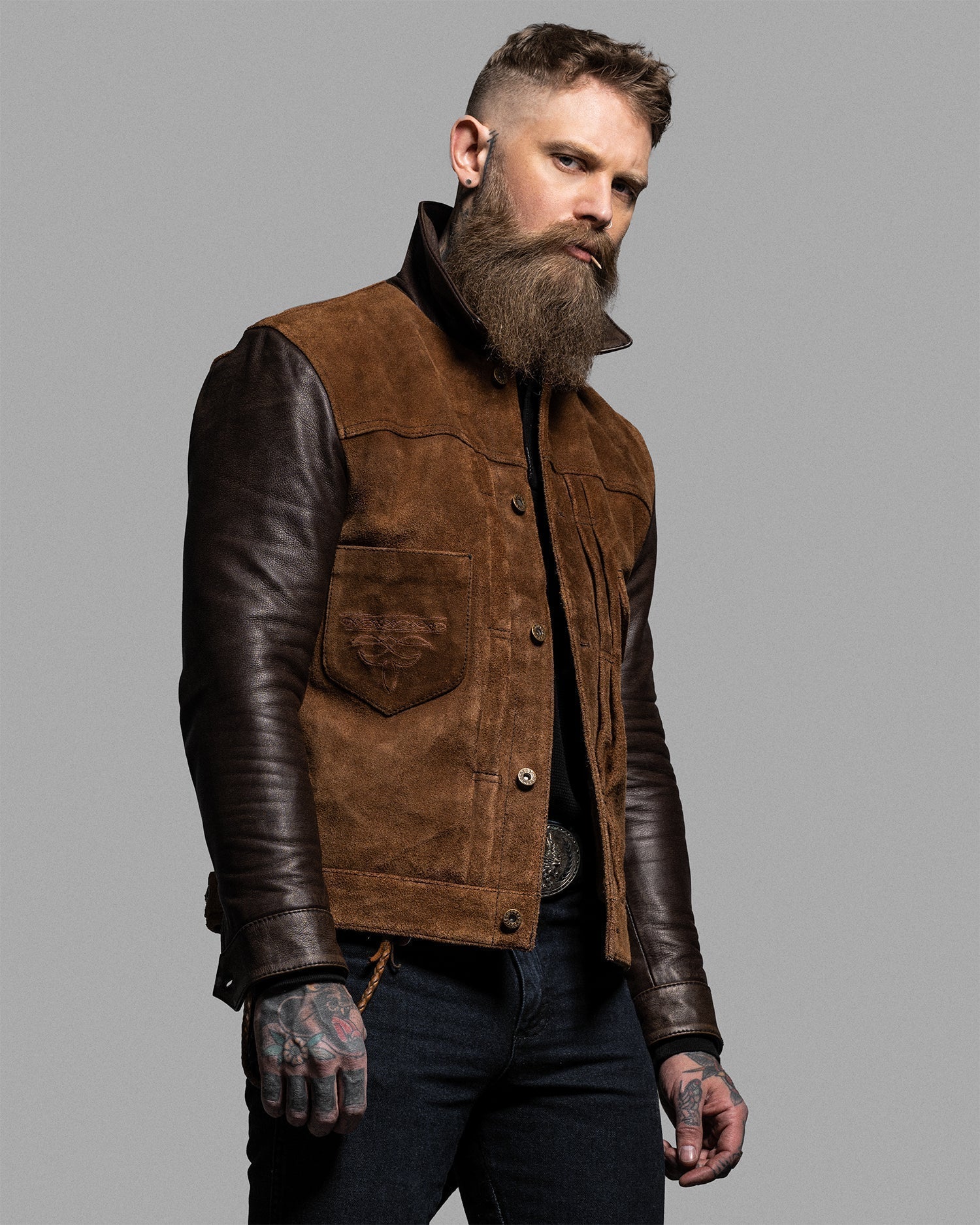 The standout mid-body pocket configuration is framed by vertical pleating, giving the jacket an assertive, utilitarian presence. Western design cues are carried through with our signature pocket medallions and contrast detailing.