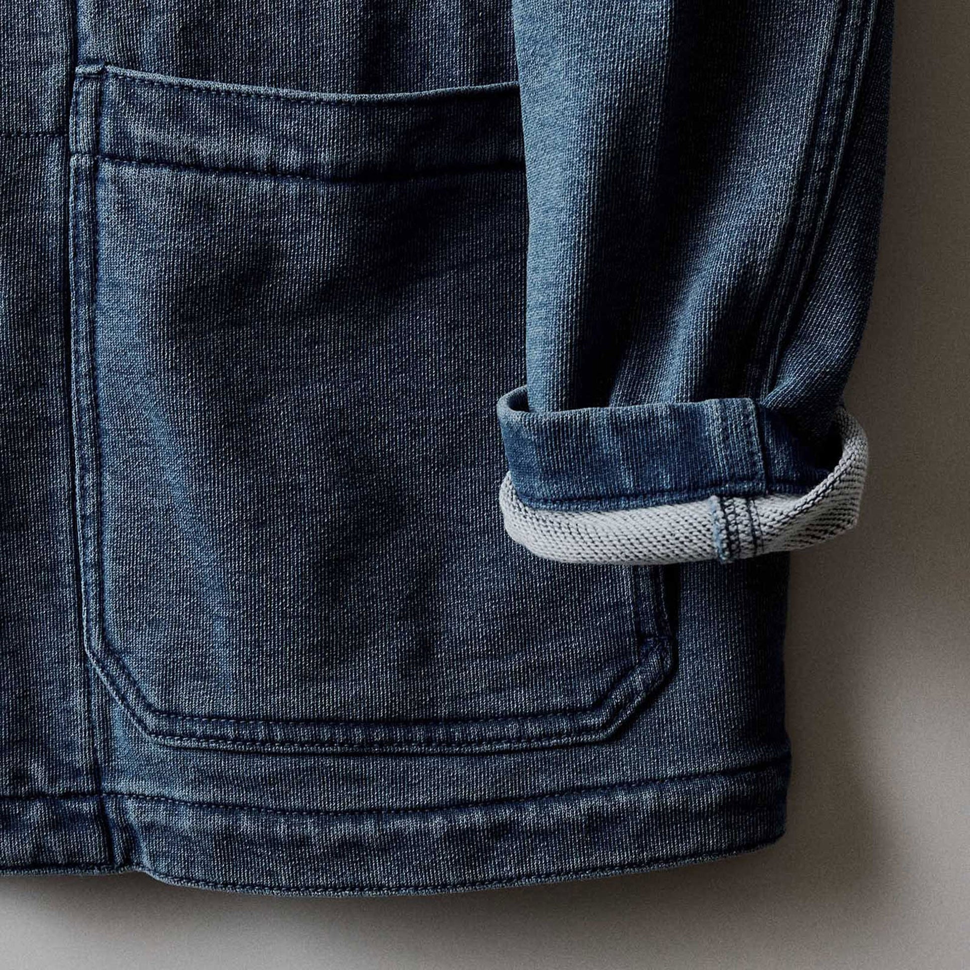 Crafted from a substantial 14-oz GOTS-certified organic cotton French terry that balances heft with breathability. Bleach washed to soften the hand and highlight tonal highs and lows in the indigo dye. Finished with reinforced stress points, herringbone taping, and unlined construction for all-day comfort and an effortless drape.
