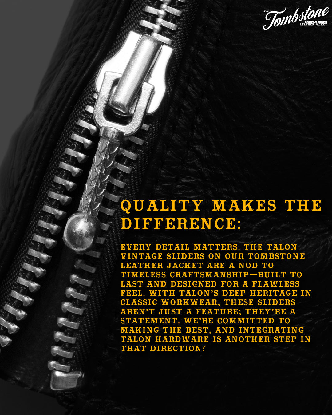 Introducing The Tombstone, our refined take on the classic double rider jacket, now enhanced with authentic Talon vintage sliders—a hallmark of quality since 1893.